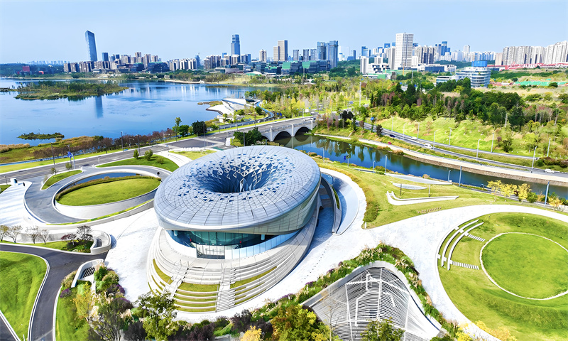 成都科创生态岛由建筑界的解构主义大师——扎哈·哈迪德团队设计。从无人机的视角来看,整岛建筑如细胞团簇一般生长、扩张,充满未来感和科技感的建筑群又仿佛是坐落在兴隆湖畔的一顶桂冠。岛上的建筑风格独特,既有现代感,又不失自然与和谐,与周围的生态环境相得益彰。
